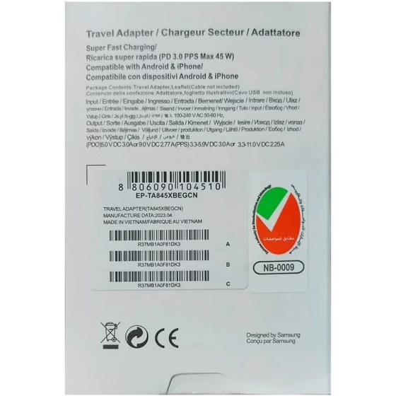 مشخصات خرید و قیمت شارژر ۴۵ وات سامسونگ سوپر فست شارژ ویتنام پک اصلی:شارژر سامسونگ مدل EP-TA845 با ظرفیت ۴۵ وات و طراحی سهپین، تجربه شارژ سریع و ایمن را برای دستگاههای شما به ارمغان میآورد. با این شارژر، زمان انتظار برای شارژ به حداقل میرسد و شما میتوانید به سرعت به کارهای روزمرهتان بپردازید. انتخابی ایدهآل برای افرادی که به دنبال عملکرد برتر هستند.