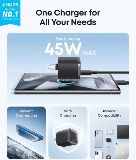 شارژر Anker A2692 از فناوری USB-C Power Delivery (PD) پشتیبانی میکند و توان خروجی واقعی ۴۵ وات را ارائه میدهد. این موضوع باعث میشود دستگاههایی مانند آیفون سری جدید، گوشیهای سامسونگ، شیائومی، آیپد و حتی مکبوک ایر یا لپتاپهای سبک با سرعت بالا و پایدار شارژ شوند. نسبت به شارژرهای معمولی، این مدل زمان شارژ را بهطور چشمگیری کاهش میدهد.