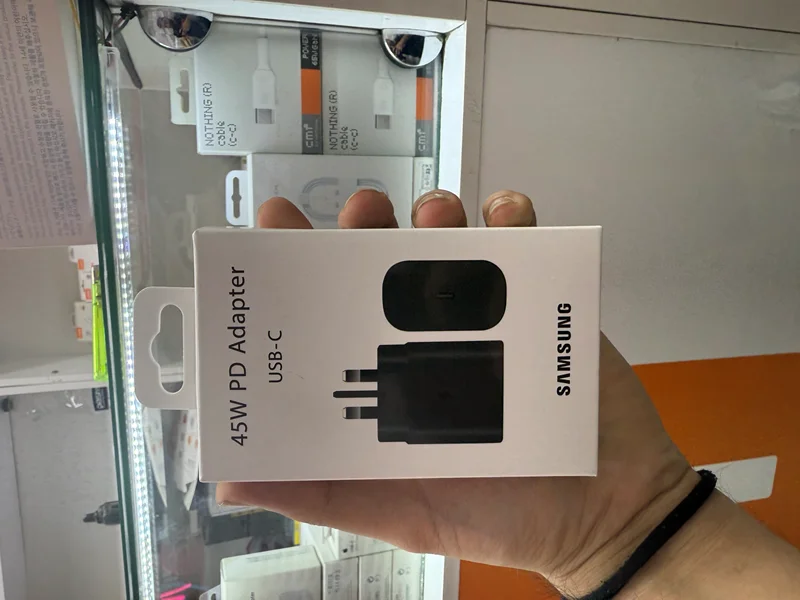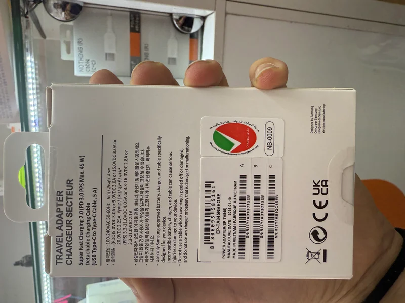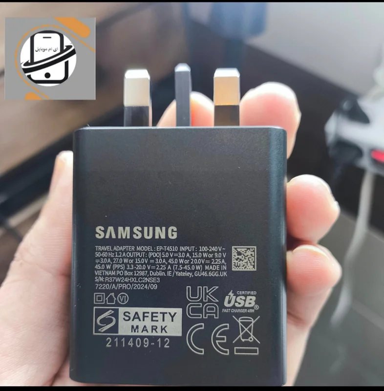 آداپتور شارژر سامسونگ S23 Ultra با توان خروجی 45 وات بالاترین سرعت شارژ را برای این دستگاه ارائه می دهد. یعنی مدت زمان شارژ شدن باتری 5000 میلی آمپری این گوشی بین 55 دقیقه تا یک ساعت می باشد. اگر مدت زمان شارژ شدن باتری گوشی از این استاندارد بیشتر یا کمتر باشد شارژر شما نسخه غیر اصل می باشد. همچنین این شارژر ولتاژ برق شهری که بین 100 تا 240 ولت می باشد را دریافت کرده و آن را به ولتاژ های 5، 9، 15 و 20 ولت تبدیل می کند. از نکات مثبت نسخه اصلی شارژر Samsung S23 Ultra محافظت از باتری گوشی می باشد. این شارژر باتری گوشی را در برابر جریان های اضافی، اتصالات کوتاه و حرارت بیش از حد به خوبی حفظ می کند. بنابراین با استفاده از نسخه اورجینال این شارژر از دستگاه خود به خوبی محافظت خواهید کرد.