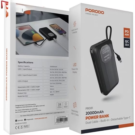 اگر به دنبال یک پاوربانک قدرتمند، بادوام و مجهز به قابلیتهای شارژ سریع هستید، پاوربانک ۲۰۰۰۰ میلیآمپرساعت پرودو Porodo مدل PD-PBFCH081 یکی از بهترین گزینههایی است که میتوانید انتخاب کنید. این پاوربانک با ظرفیت بالا، خروجی پرقدرت ۴۵ وات از طریق پورت USB-C و طراحی کاربردیِ دارای دو کابل داخلی، یکی از کاملترین پاوربانکهای موجود در بازار محسوب میشود. چه برای مسافرت، چه برای استفاده روزمره و چه برای شارژ همزمان چند دستگاه، این مدل دقیقاً همان چیزی است که نیاز دارید.
